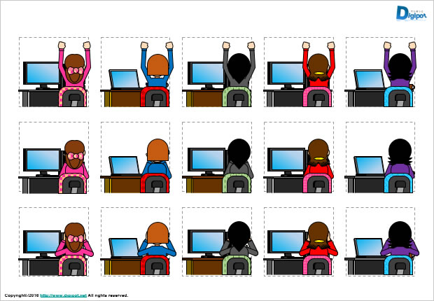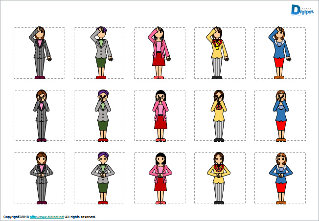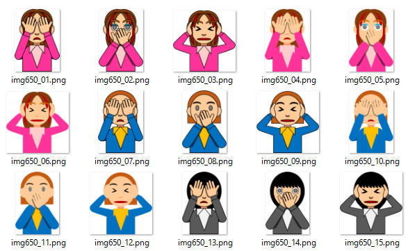 パワーポイントの図形機能で作成した、見ない聞かない言わないポーズのビジネスウーマンのイラスト画像です。PPTX形式、PNG形式画像で作成しています。