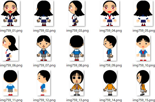 フリー、無料で使える5人の女子高生をベースに二頭身風にデフォルメした、かわいい女子高校生のいろいろなポーズのイラスト集です。パワーポイント、PNG形式画像を用意しております。