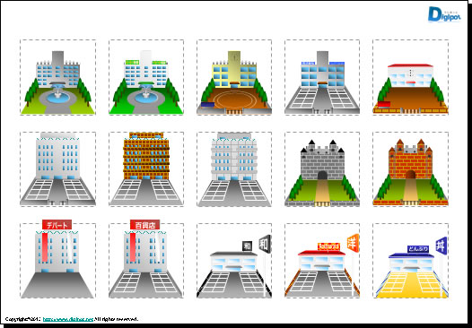 フリーで使えるパワーポイントの図形機能で作成した、建物のイラスト画像です。PPTX形式、PNG形式画像で作成しています。