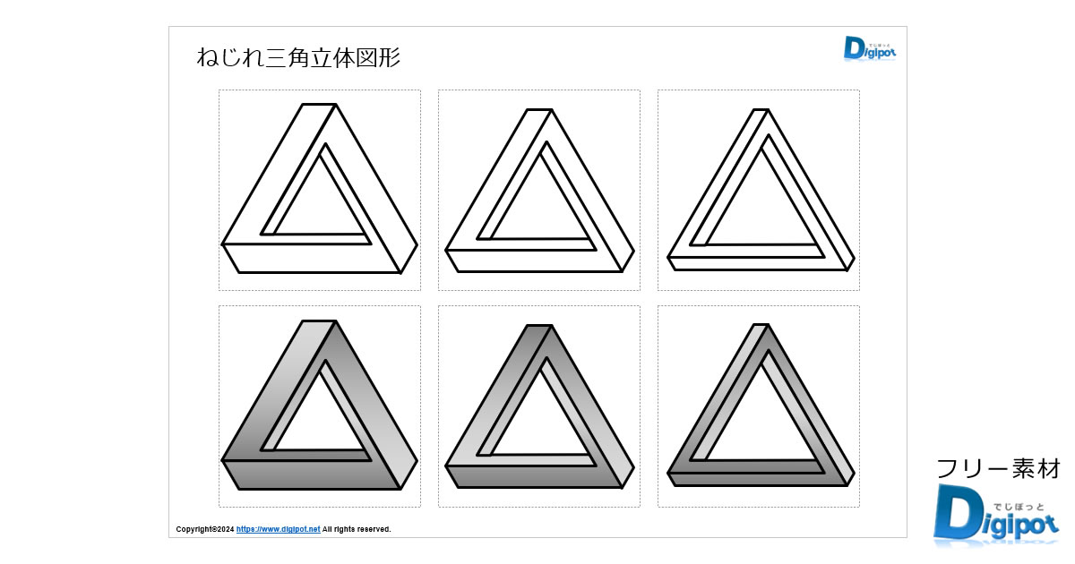 フリー、無料で使えるねじれ三角立体図形画像です。パワーポイントPPTX形式、エクセルXLSX形式、ワードDOCX形式ファイルを用意しています。