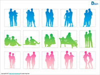 フリー、無料で使えるカップル、夫婦のシルエット画像です。パワーポイントPPTX形式、PNG形式画像で作成しています。制作は主に図形機能を使っています。白黒シルエットとカラーシルエットの2パターン作成しています。