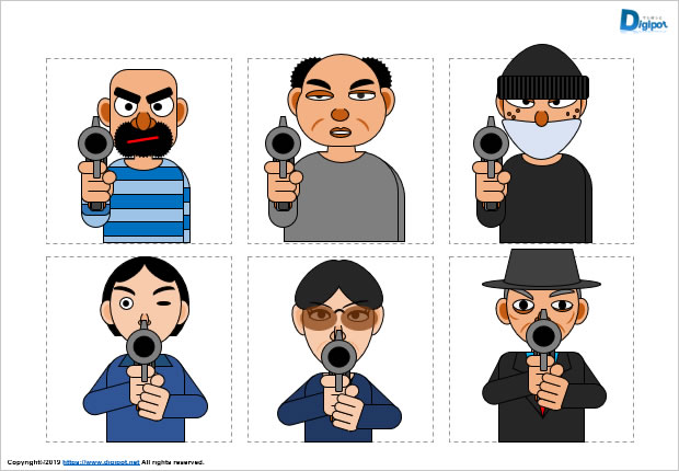 ピストルを向ける人物のイラスト、拳銃を使う人、銃を構える、脅迫、強盗犯、フチ有りフチ無しなど12種類。