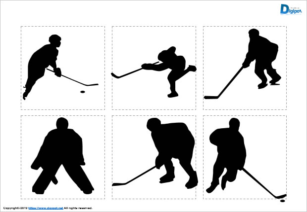アイスホッケーのシルエット、アイスホッケープレイヤー、ゴールキーパー、パス、シュートのシルエット、白黒、グラデーションなど12パターン