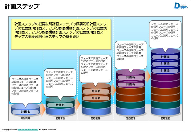 フリー、無料で使える年度別計画ステップ表テンプレート画像です。年度別の計画表です。パワーポイントPPTX形式で作成しています。