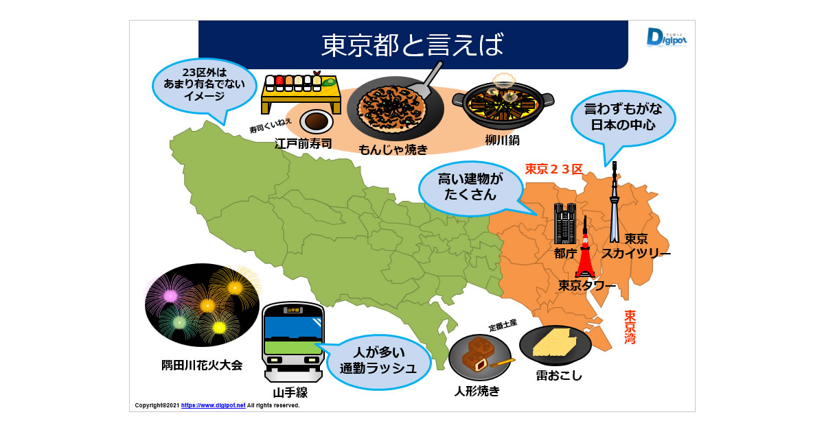 フリー、無料で使える東京都をイメージするイラスト画像と東京都の特産や名産、地域行事やイメージを紹介する資料サンプルです。パワーポイントPPTX形式データとPNG透明ファイル形式のイラストを用意しています。資料作成のテンプレートや各種素材にご活用ください。