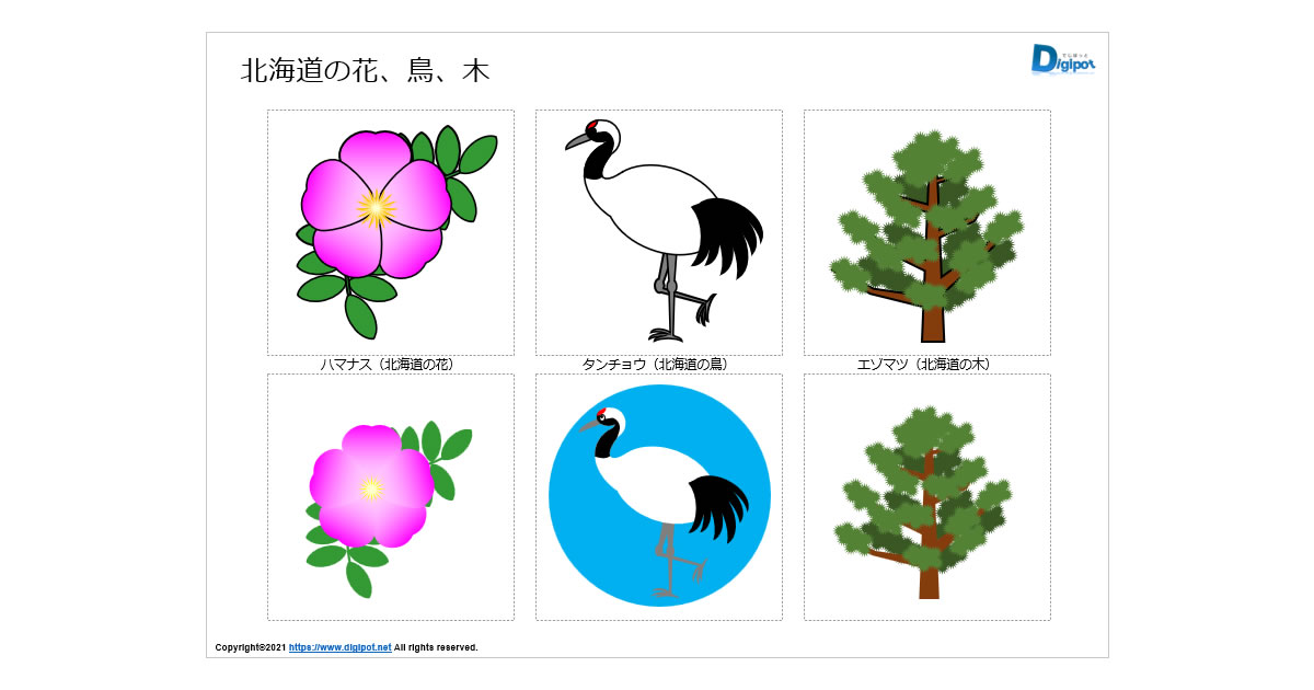 北海道の花はハマナス、北海道の木はエゾマツ、北海道の鳥はタンチョウです。各種北海道の資料づくりの素材などにご活用ください。