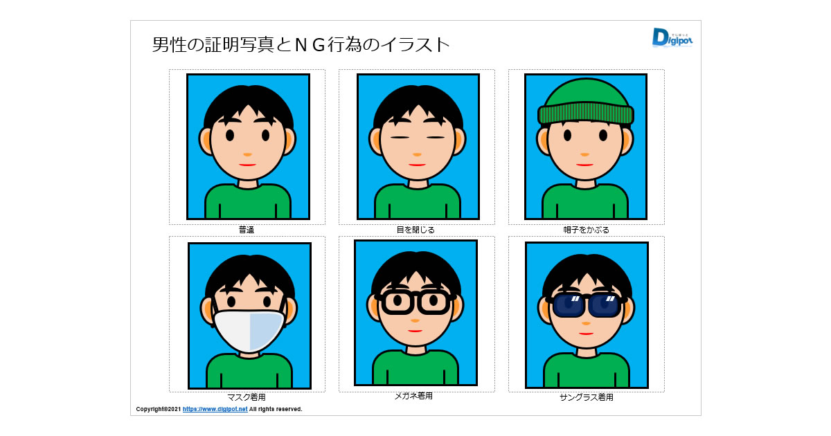 男性の証明写真とNG行為のイラスト、目を閉じる、マスクをする、サングラス、帽子をかぶる、フチ有フチ無しなど12種類