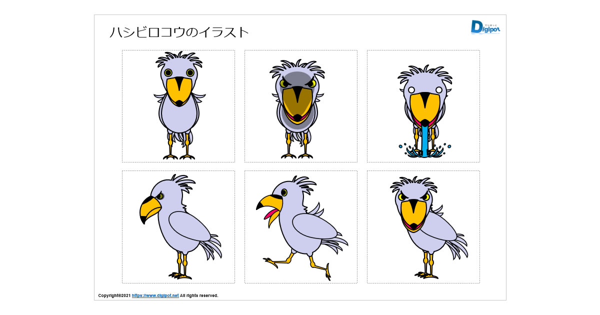 フリー、無料で使えるハシビロコウのイラスト画像です。パワーポイントPPTX形式と、パワーポイントから書き出したPNG透明形式ファイル版を用意しています。