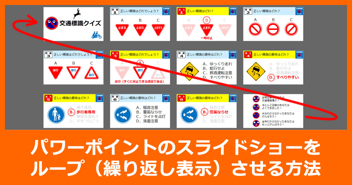 宣伝用に使用するデジタルサイネージなどではスライドを1ページ目から順番に表示させ最後で止まらずに、スライドの最初に戻ってループ表示させる必要があります。