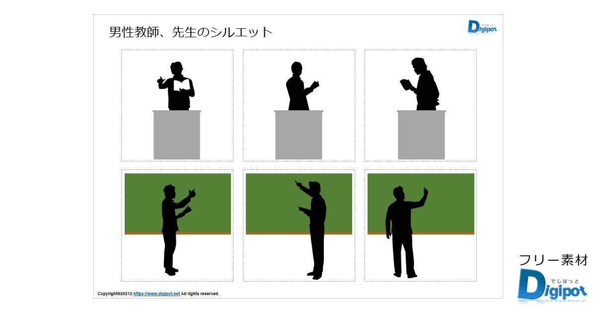 フリー、無料で使える男性教師、先生のシルエット画像です。パワーポイントPPTX形式と、パワーポイントから書き出したPNG透明形式ファイル版を用意しています。