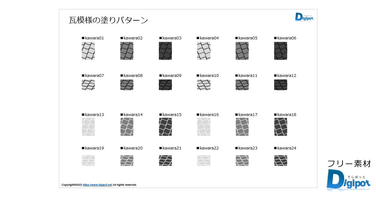 瓦、屋根瓦模様の塗りパターン、斜め、正面、各種カラーバリエーションなど48パターン
