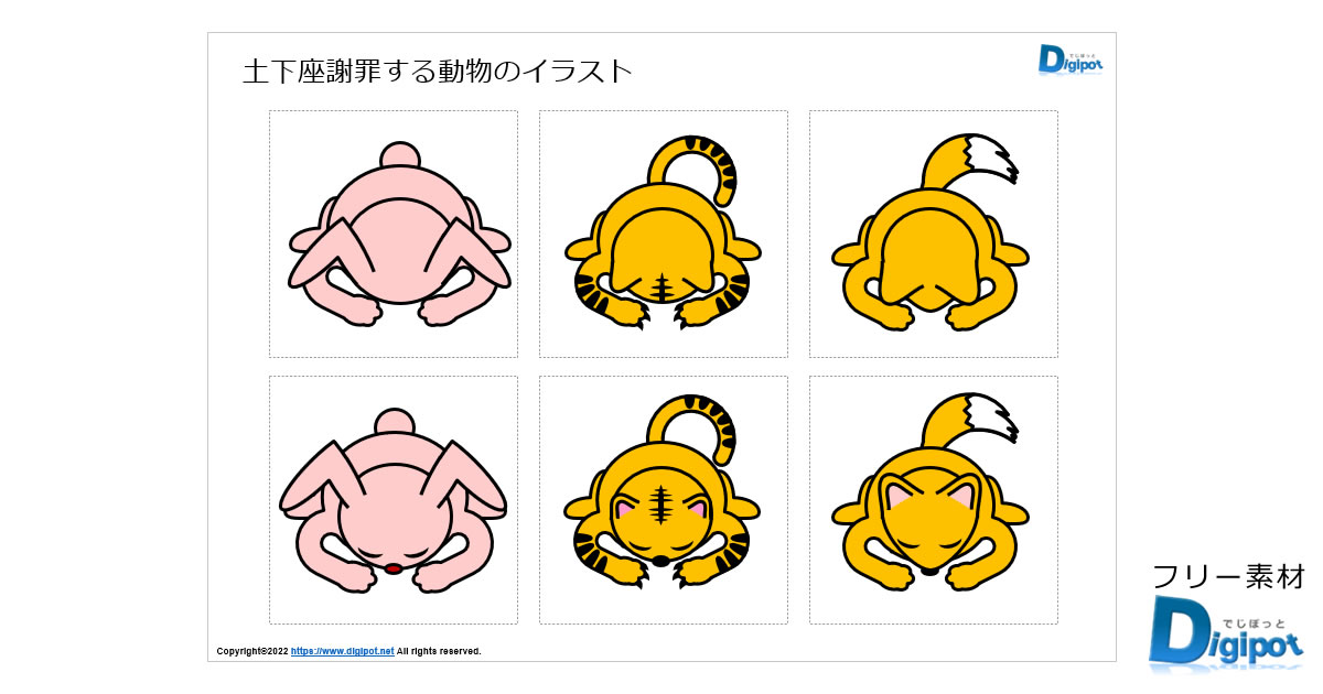 フリー、無料で使える土下座謝罪する動物のイラスト画像です。パワーポイントPPTX形式と、パワーポイントから書き出したPNG透明形式ファイル版を用意しています。