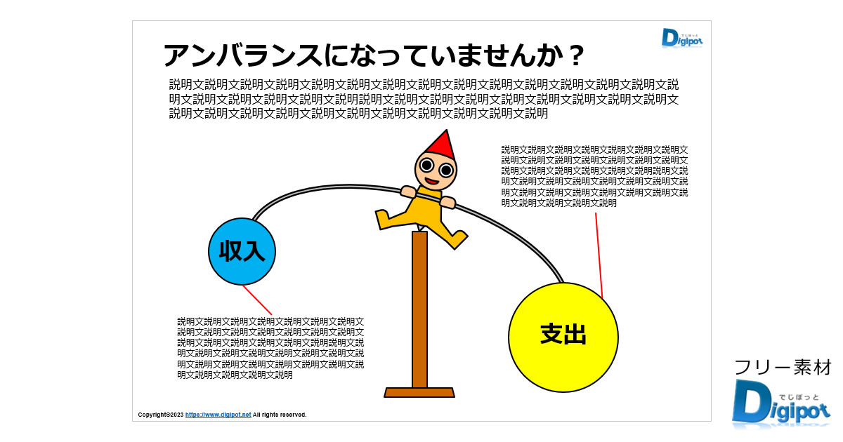 フリー、無料で使えるやじろべえを使った資料テンプレートです。パワーポイントPPTX形式で制作しています。