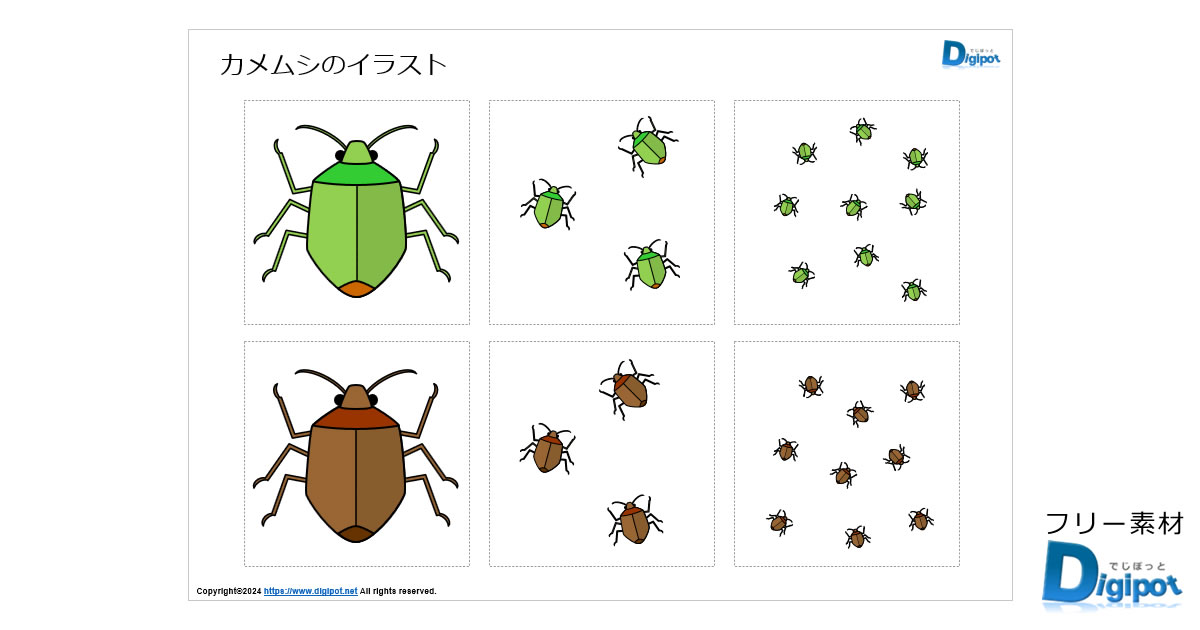 フリー、無料で使えるカメムシのイラスト画像です。パワーポイントPPTX形式、PNG透明ファイル形式、エクセルXLSX形式、ワードDOCX形式ファイルを用意しています。