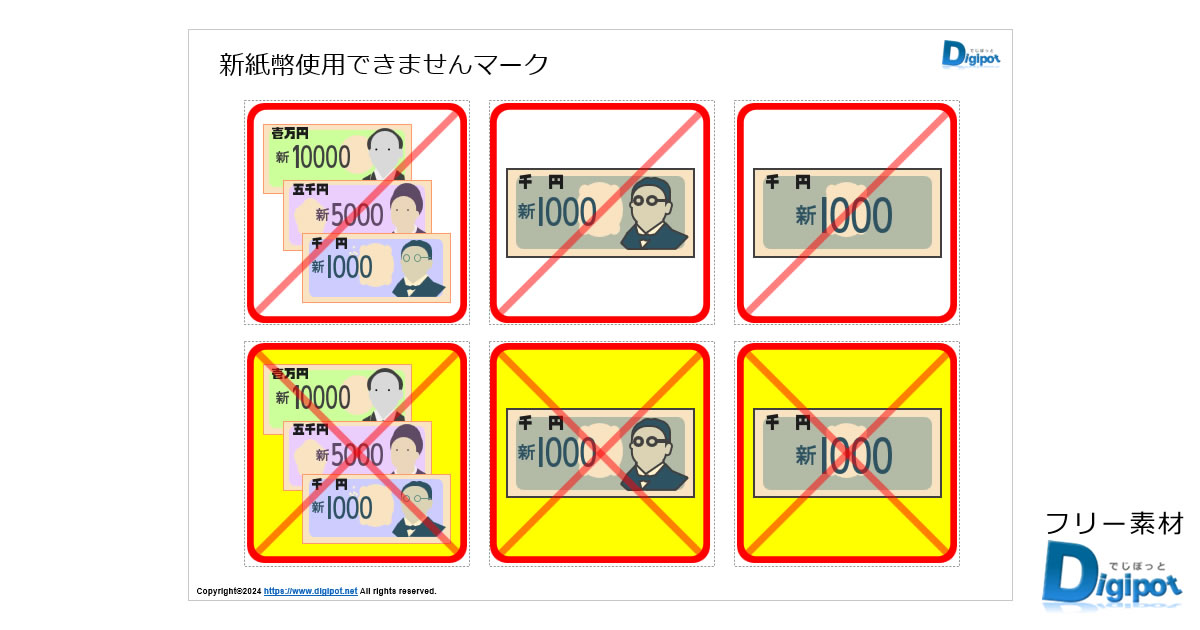 - 「新紙幣は使用できません」「千円札は使えません」などの貼り紙の素材に