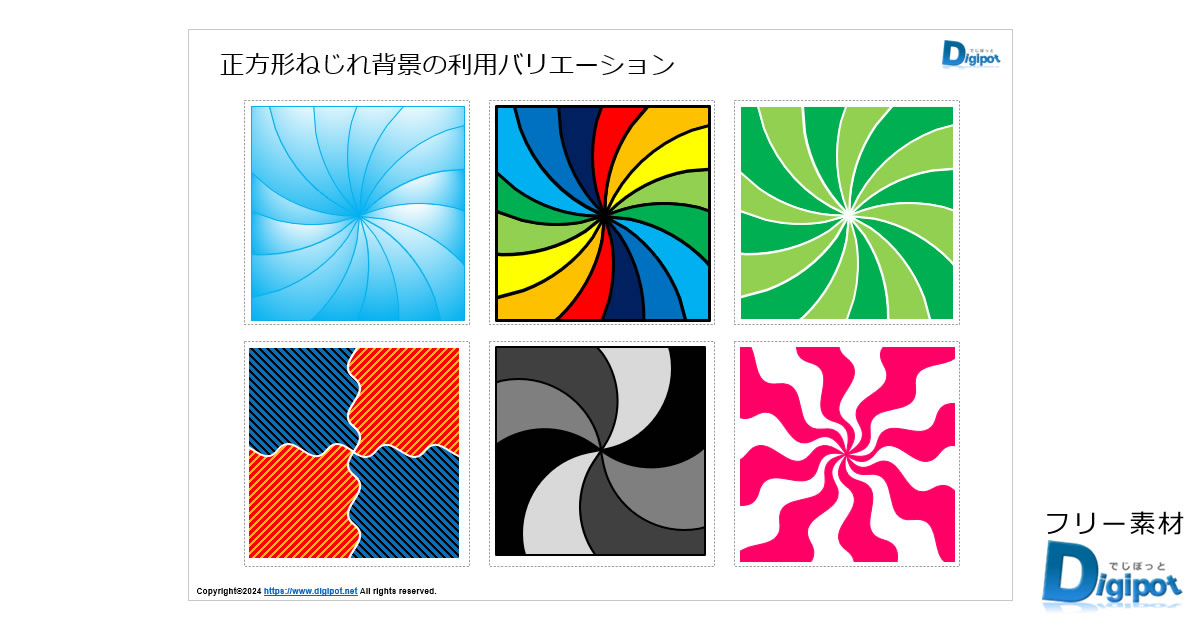 正方形ねじれ背景図形、各種ねじれタイプ、利用サンプルなど18パターン