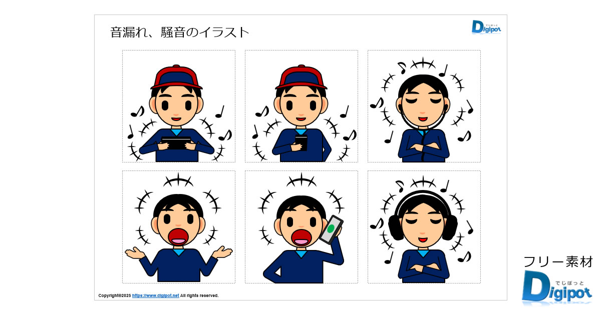 フリー、無料で使える音漏れ、騒音のイラスト画像です。パワーポイントPPTX形式、PNG透明ファイル形式、エクセルXLSX形式、ワードDOCX形式ファイルを用意しています。