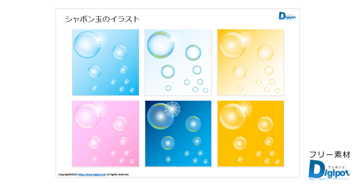 フリー、無料で使えるシャボン玉のイラスト画像です。パワーポイントPPTX形式、PNG透明ファイル形式、エクセルXLSX形式、ワードDOCX形式ファイルを用意しています。