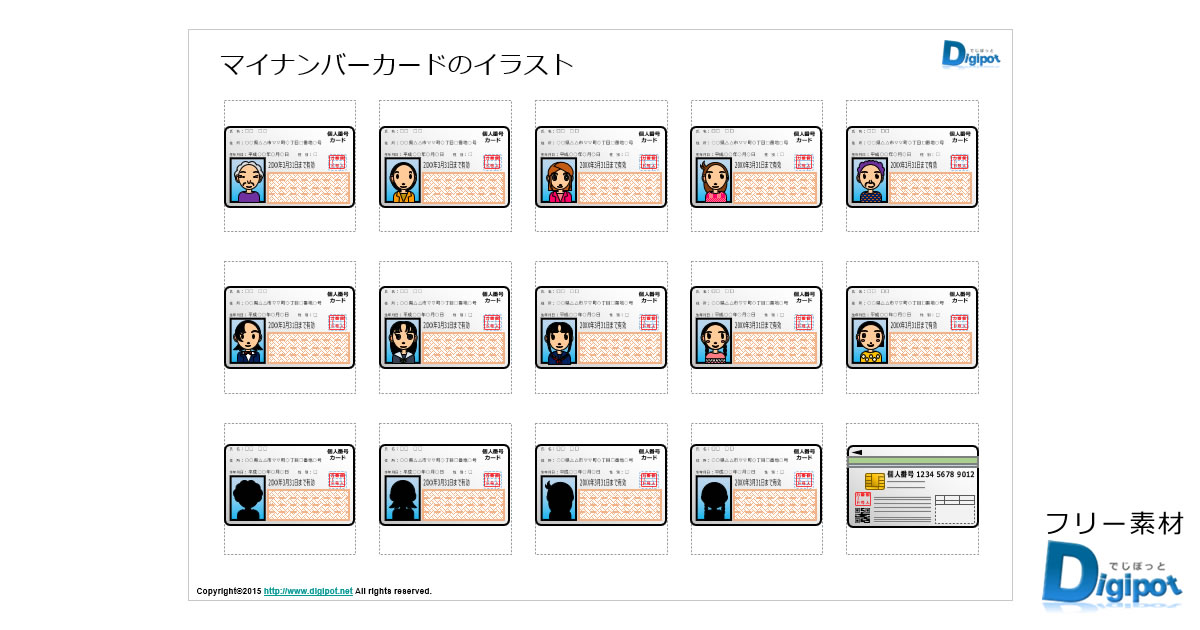フリー、無料で使えるマイナンバーカードのイラスト画像です。PPTX形式、PNG形式画像で、縁取り有りと縁取り無しの2パターン作成しております。