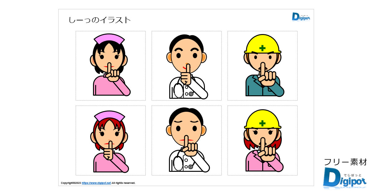 しーっのイラスト、しずかに、お静かにのイメージ、お医者さん、看護師、男性、女性、男の子、女の子、作業員など12種類