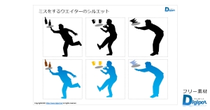 フリー、無料で使えるミスをするウエイターのシルエット画像です。パワーポイントPPTX形式とPNG透明ファイル形式で作成しています。6パターンあります。