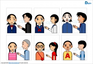 フリー、無料で使えるおしゃべりと感染イメージのイラスト画像です。パワーポイントPPTX形式、PNG形式画像で作成しています。24パターンあります。