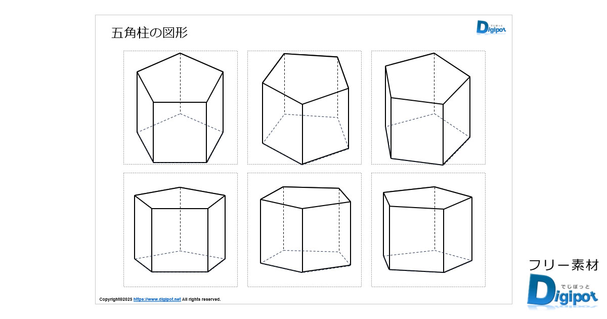 フリー、無料で使える五角柱の図形画像です。パワーポイントPPTX形式、PNG透明ファイル形式、エクセルXLSX形式、ワードDOCX形式ファイルで作成しています。