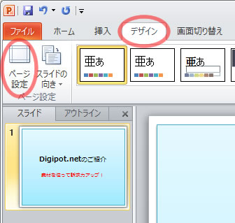 PowerPoint2003の場合は、メニューから「ファイル」→「ページ設定」を選択します。