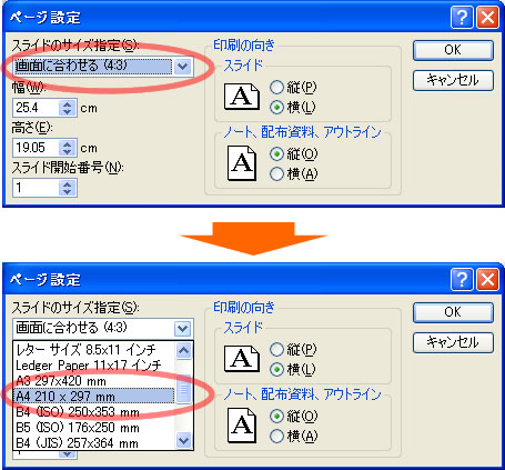 デフォルト値からA4また印刷したい任意のサイズ項目を選択します。