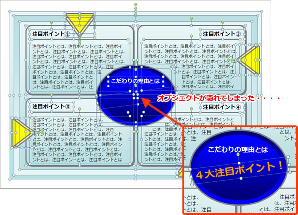 パワーポイントの画面の下に隠れてしまったオブジェクトを選択する