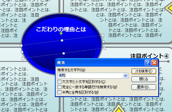 該当する文字を入力して検索します。同じ文字がある場合は、「次を検索」をクリックすると次のオブジェクトにターゲットが移行します。