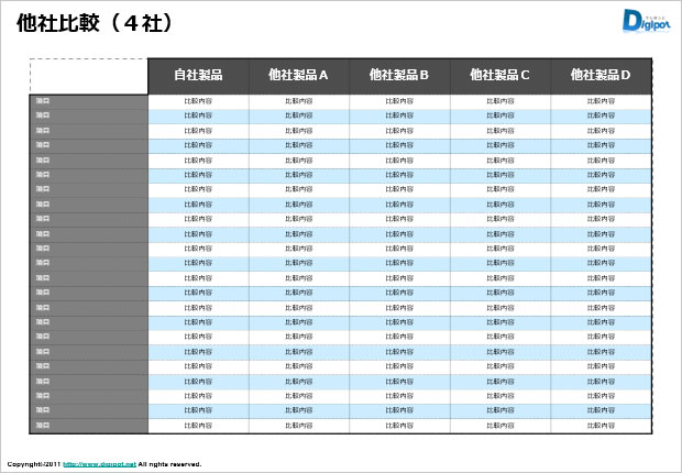 フリー、無料で使える比較表のテンプレートです。パワーポイントPPTX形式、エクセルXLSX形式で作成しています。
