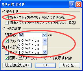 位置合わせのにチェックが入っていると、オブジェクトの配置が強制的にグリッドに合うようになります。グリッドの間隔は、細やかなレイアウトをしなければ4グリッド/cmで充分です。