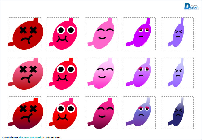 胃、胃袋、胃腸のイラスト、調子の悪い胃袋、絶好調の胃袋、ほっそりした胃袋、しおれた胃袋、食べ過ぎ胃袋など
