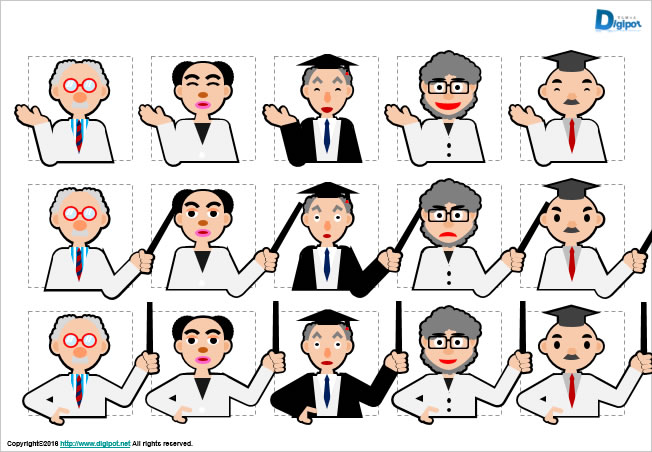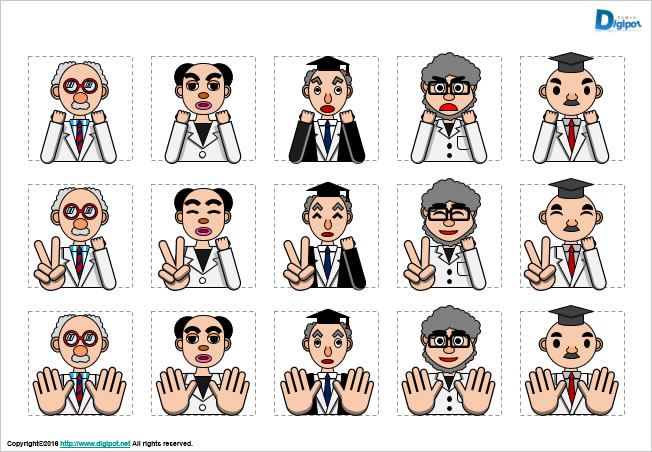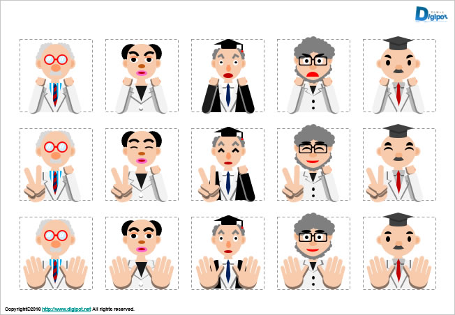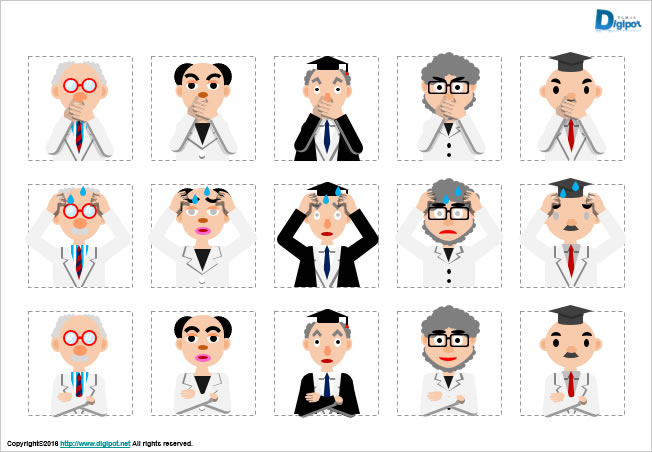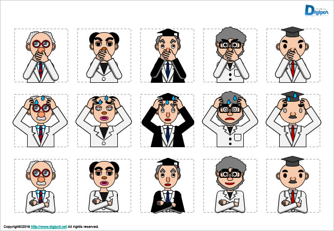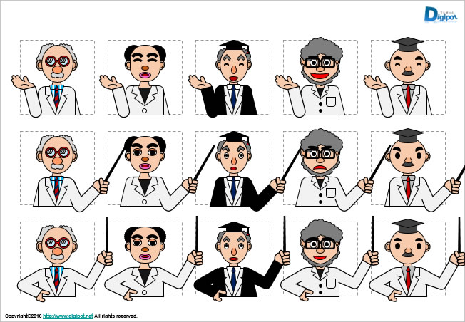 科学者、博士、先生、教授、指を差す、考えるなどのポーズ、フチ有りフチ無しなど30種類