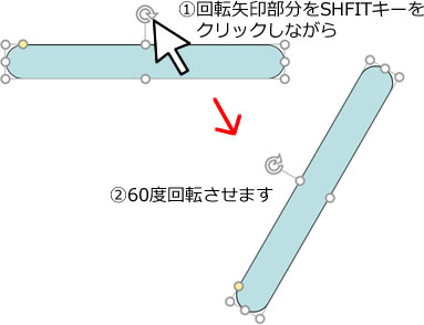 コピーした図形を選択し、(1)回転矢印部分をSHIFTキーをクリックしながらカーソルを動かすと図形が固定角度で回転します。