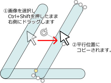 図形を選択した後、Ctrl+Shiftを押したまま右側にドラッグすると平行位置にコピーできます。