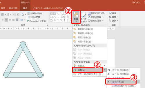 コピーした図形を選択した状態で(1)配置を選択し、2回転を選択、3左右反転を選択します。