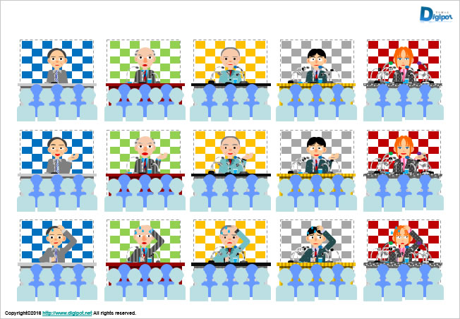 フリー、無料で使える記者会見のイラスト画像です。PPTX形式で、縁取り有りと縁取り無しの2パターン作成しております。