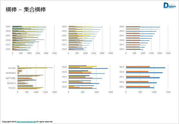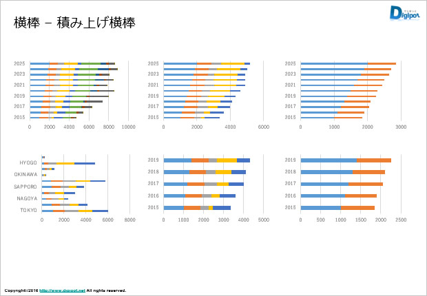 フリー、無料で使えるパワーポイントのグラフ機能から作成した横棒グラフのサンプルです。PPTX形式、PNG形式画像で作成しています。