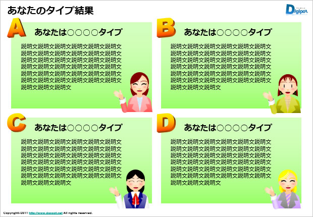 利用者にYES/NOで回答してもらうことで簡易な性格分析や商品・サービスの推薦フローに誘導するためのテンプレートです。アンケート形式で顧客の嗜好を把握したり、社内の意思決定フローで条件分岐を明確にする用途に向いています。文字部分を差し替えて業種や目的に合わせた設問を作成でき、イベントや販促での来場者誘導にも活用可能です。結果に基づく次のアクションを明示すると実務的な価値が高まります。