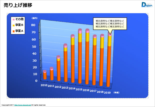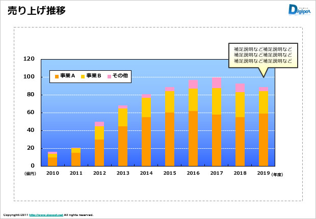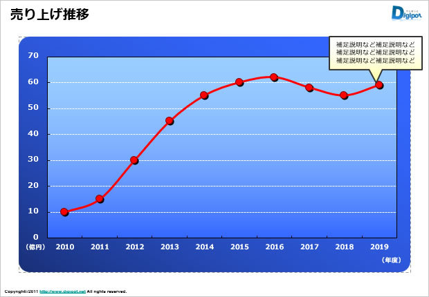 フリー、無料で使える売り上げ推移グラフのサンプルテンプレート画像です。パワーポイントPPTX形式で作成しています。
