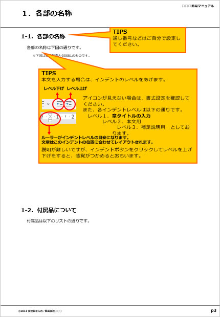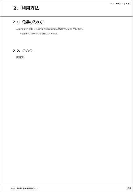 - マニュアルは読みやすくする為に、章立てしてナンバリングを打つ。