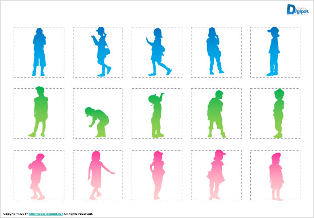 子供のシルエット、男の子のシルエット、女の子のシルエット、歩く・走る・立つ・眺めるなど子供の動作のシルエット、カラーバリエーション、白黒シルエットなど30パターン。