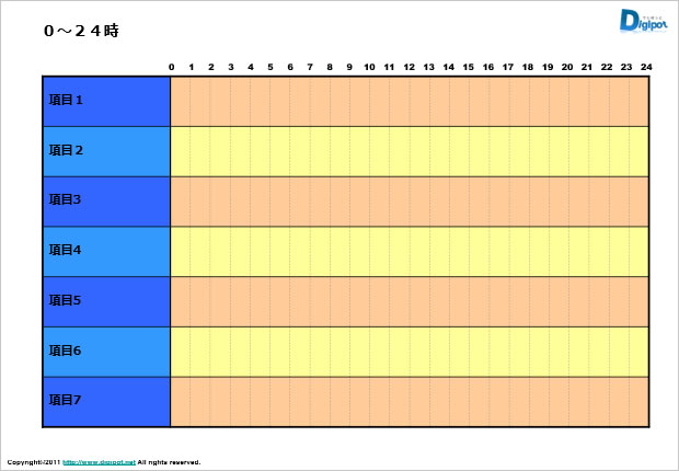 1日の時間スケジュールなどを作成するタイムテーブルのテンプレートです。各種時間パターンを作成しております。プログラムや作業の時間スケジュールなどを作りたい時にご利用ください。また、背景色や文字色などは自由に変更してご活用ください。