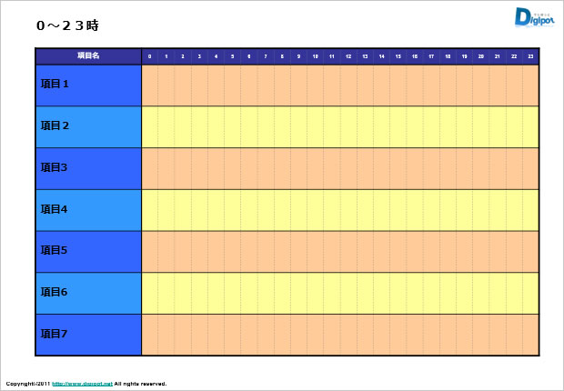 0~23時のタイムテーブル、7~21時のタイムテーブル、項目あり/なし、白黒/カラーバージョン、時間のみのテーブル、サンプル、パーツ素材など13ページ