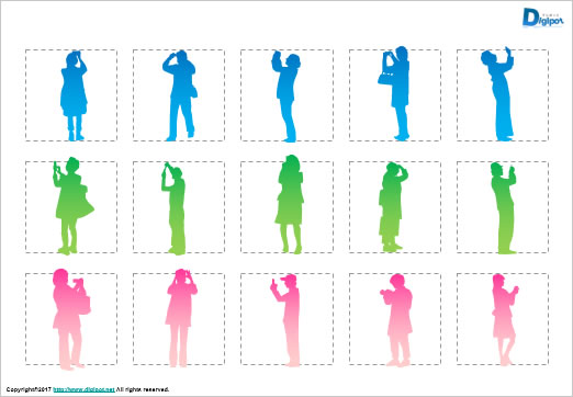 撮影する男性のシルエット、撮影女性のシルエット、スマホ撮影する人のシルエット、カメラ撮影する人のシルエット、カラーバリエーション、白黒シルエットなど30パターン。