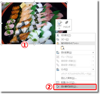 写真や図を選択した状態で、(1)右クリックでメニューを表示させ、2図の書式設定を選択します。