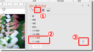 図の書式設定のウインドウが開いたら、(1)効果のタブを選択し、2アート効果をクリックし、詳細設定を表示させます。3任意の効果を選択します。詳細はそれぞれの効果によって違いますので、実際に画面上で確認しながら効果の強さなどを調整してください。