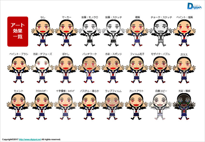 パワーポイント2016では、22個のアート効果が実装されております。イラストの場合と写真の場合の実装比較サンプルを以下に示します。